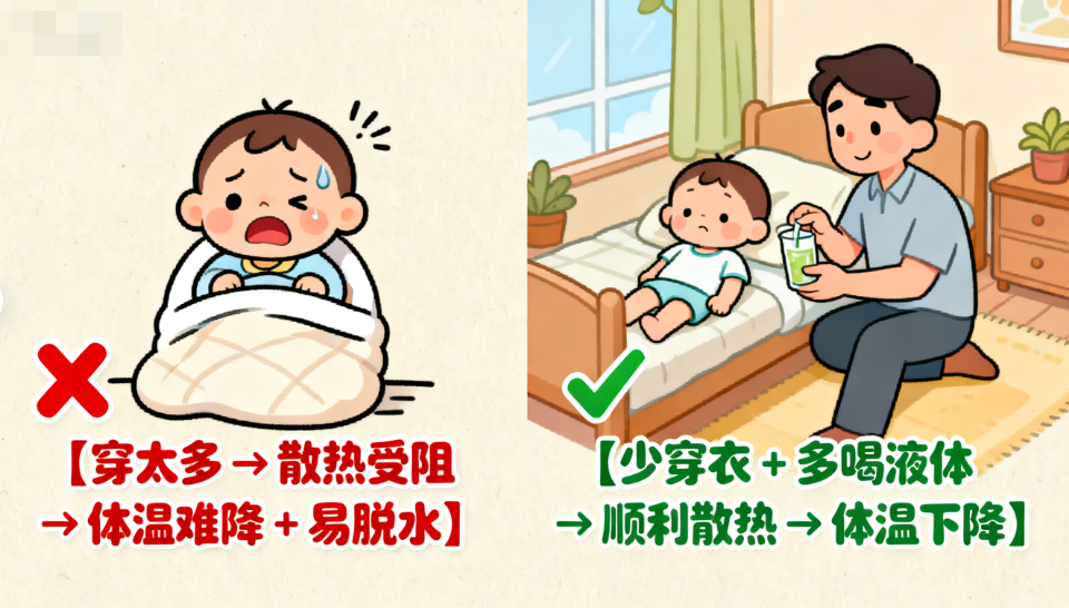 爸爸(护士): “记住!退烧药只是把体温‘设定值’调低,真正降温要靠皮肤散热!