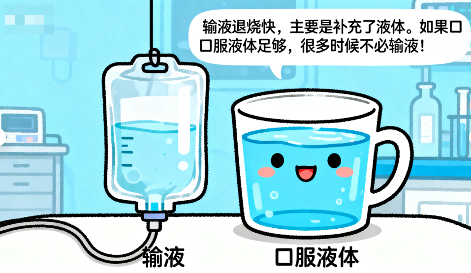 输液退烧快,主要是补充了液体,这说明孩子体内水分不够,如果我们让他口服的液体够了,也就意味着不用静脉输液。