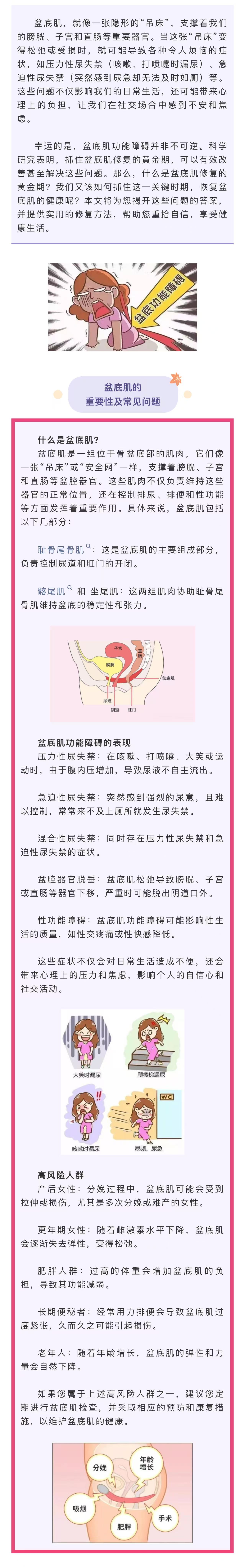 图文简介: 盆底肌,就像一张隐形的“吊床”,支撑着我们的膀胱、子宫和直肠等重要器官。当这张“吊床”变得松弛或受损时,就可能导致各种令人烦恼的症状。抓住盆底肌修复的黄金期,可以有效改善甚至解决这些问题。