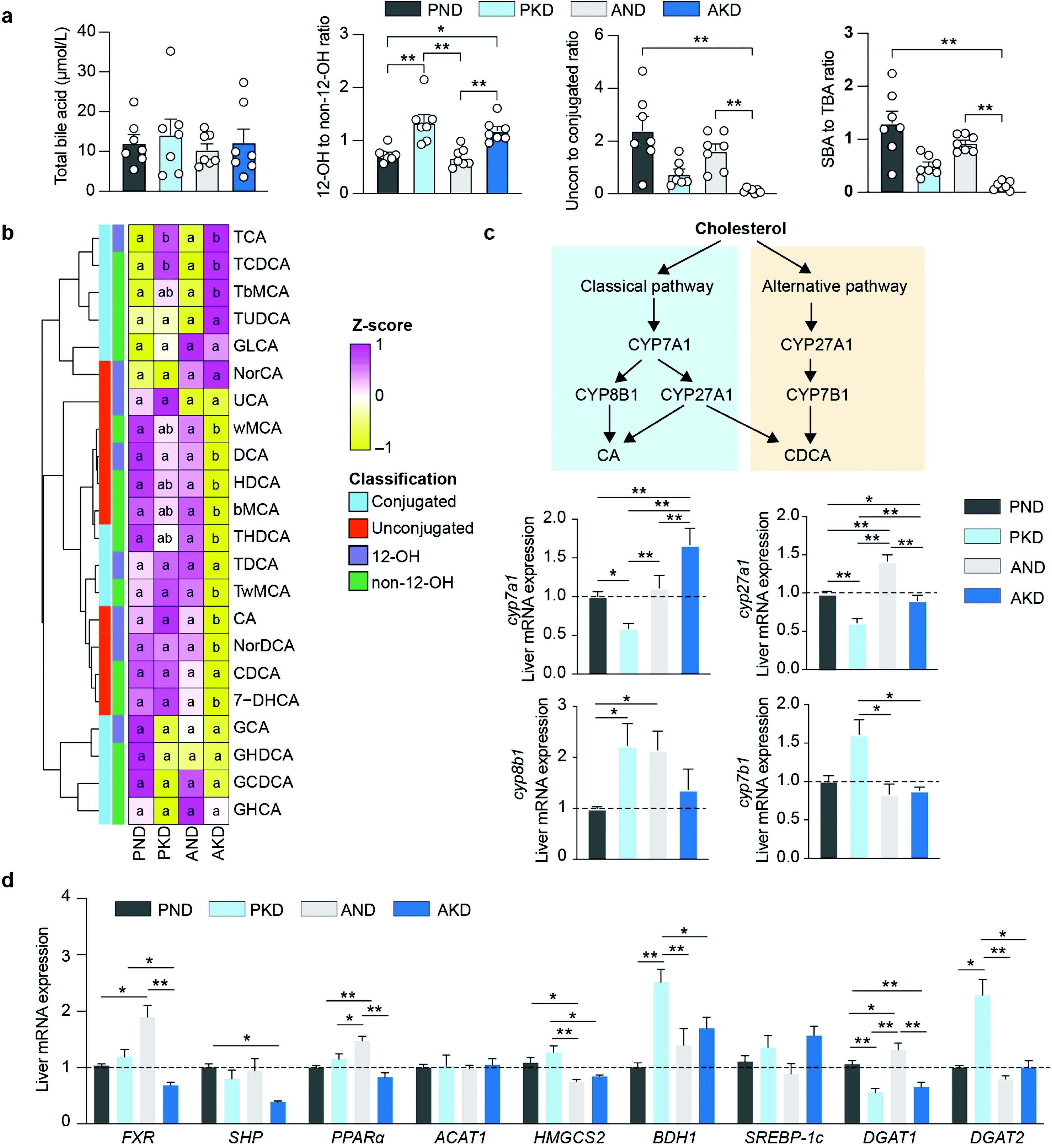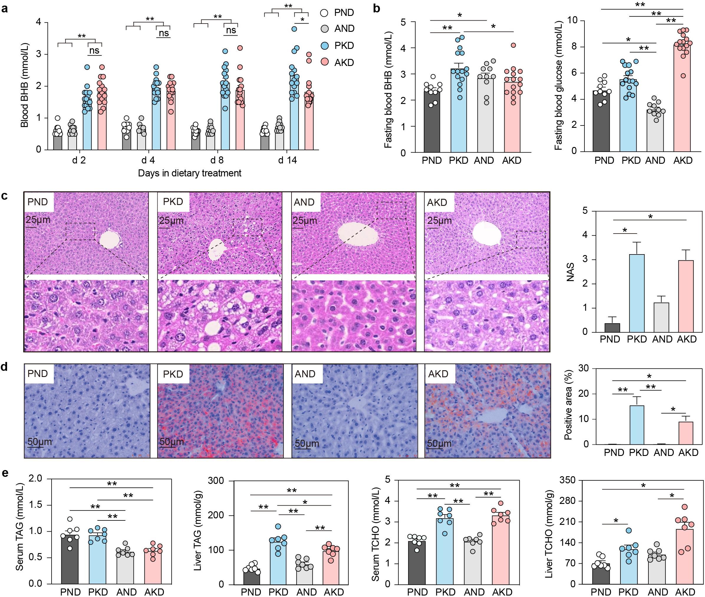 通常情况下,限制碳水摄入会促使肝脏通过“酮体生成”(ketogenesis)路径产生β‑羟基丁酸(BHB),作为能量替代物。这一过程在短期内可改善胰岛素敏感性和体重控制,但若持续刺激,酮体浓度升高可能转为病理状态,导致肝脏脂肪堆积、胰岛素抵抗,甚至炎症。研究者发现,长期 KD 饮食使血液 BHB 浓度显著上升,同时肝脏内甘油三酯(TAG)含量同步增加;而抗生素处理组的变化更为剧烈,暗示肠道菌群缺失放大了 KD 的不良代谢效应。