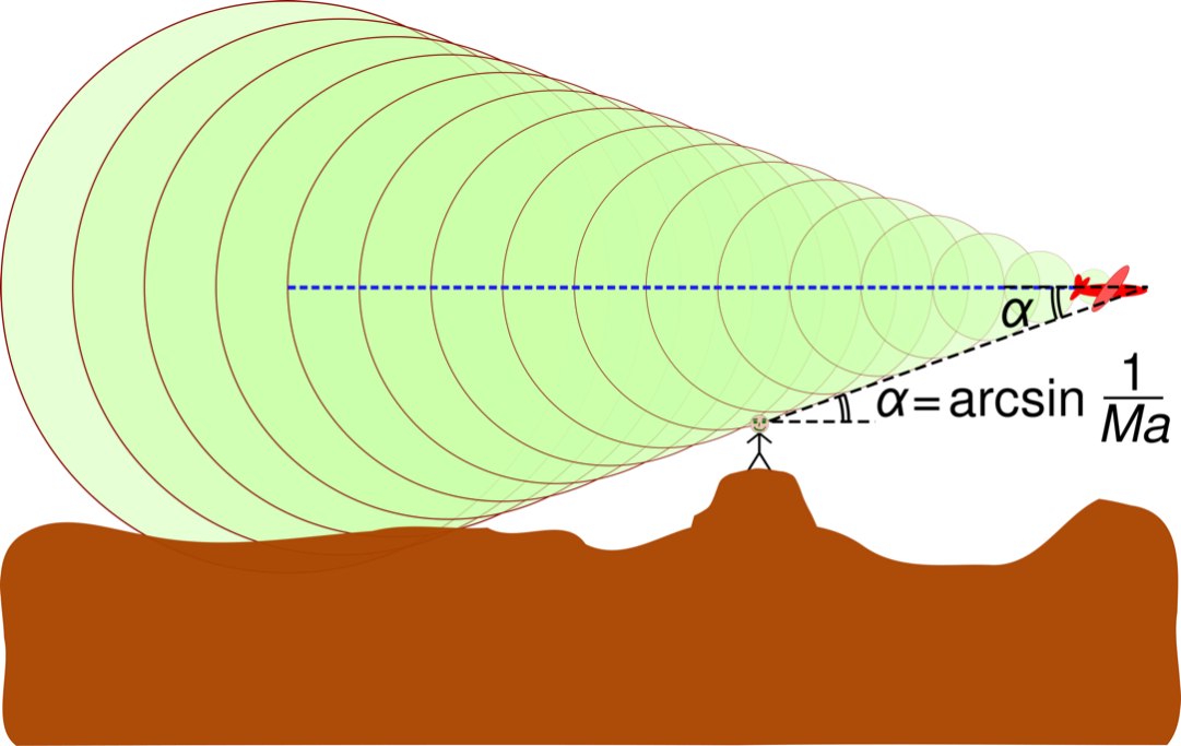 飞机生成的音爆示意图,此时时速约为2.82倍声速(2.82马赫),圆锥角度为20°。当圆锥边缘的冲击波穿越观察者的位置,观察者会听到爆炸声,但在此之前他是听不到音爆的。