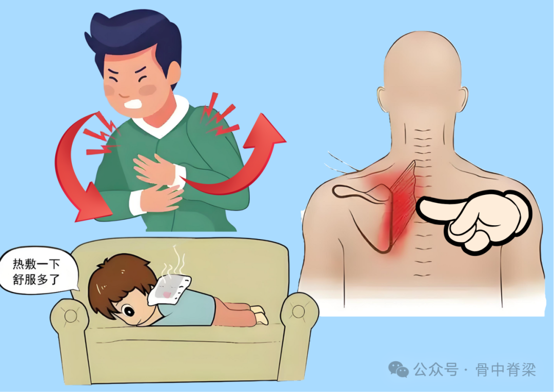 用热水袋敷疼痛处15分钟,若症状减轻,支持胸椎源性疼痛。