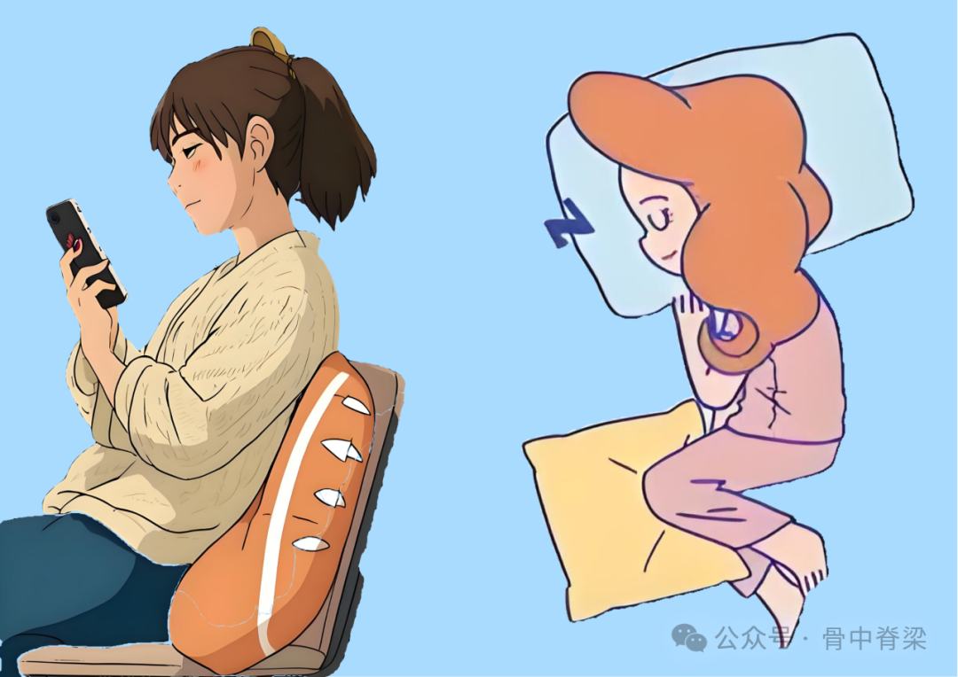 睡姿:侧卧时双腿夹枕头,保持脊柱中立。