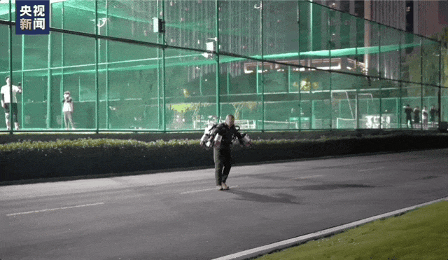 伴随着一阵轰鸣,一名男子背着一个“大包”,双臂张开,只见他用力一蹬,竟飞到了离地近两米的半空中,并稳稳悬停!