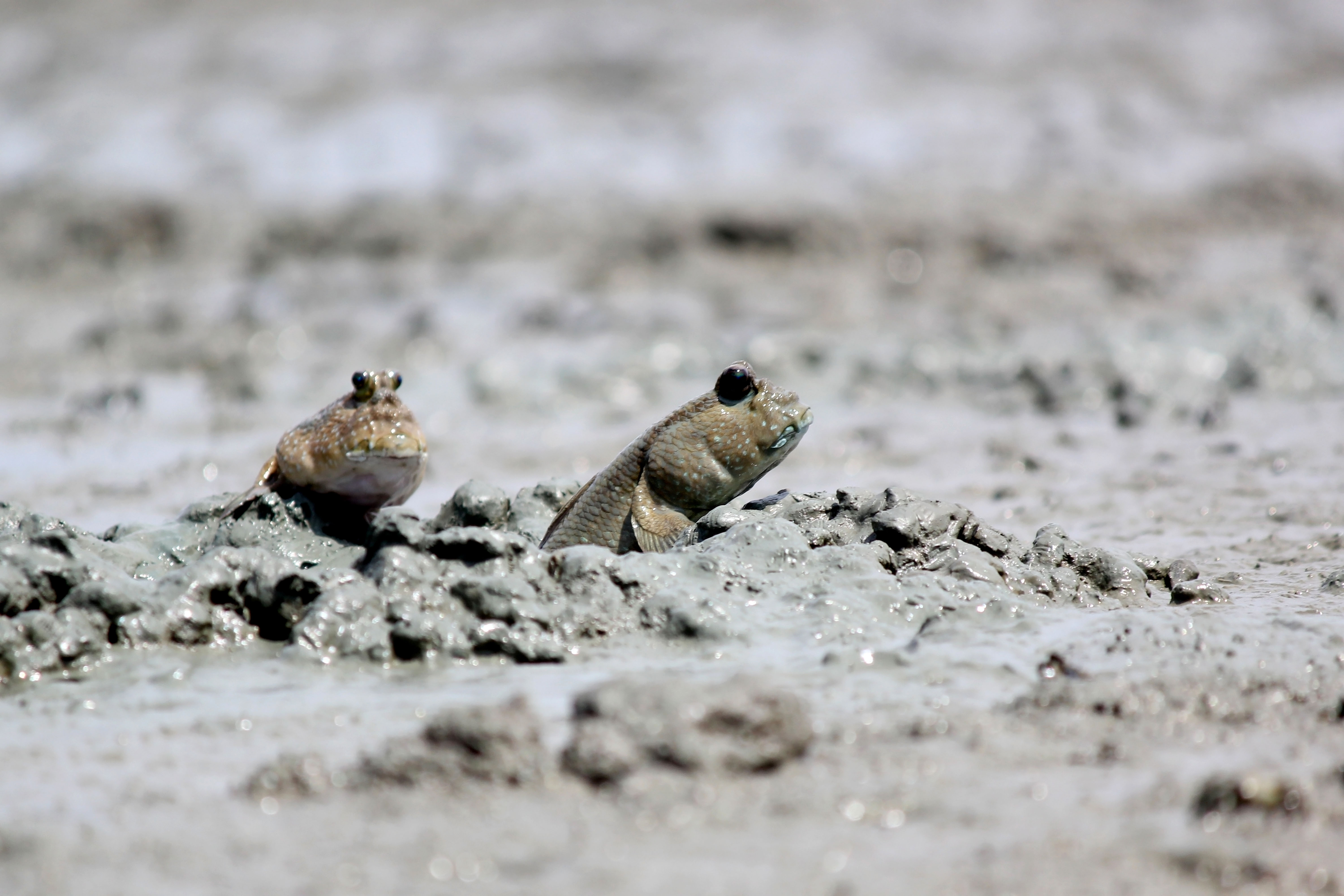 弹涂鱼体呈灰褐色具暗斑,双眼突出于头顶且可360度旋转。胸鳍肌基发达演化成“伪足”,鳞片分泌黏液防止干燥,皮肤兼具鳃呼吸与皮肤呼吸功能,其尾鳍不仅是游泳工具,更能在滩涂上提供弹跳推力。