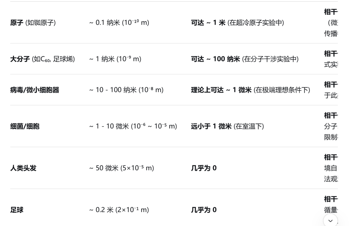 诺奖官方的通俗宣传材料的题目是“人体尺度的量子性质”,首先我们需要探究人体尺度是否有量子效应,这个问题并不是一个简单的问题,过去研究人员已针对物体尺寸和量子相干长度进行了研究。简单的想法是,物体具有波粒二象性,其波函数的空间相干距离就是量子相干长度,问题是类似人体这样的宏观物体为什么我们通常认为是经典的,和量子效应无关。大模型(Deepseek)针对此问题给出的回答整理如下: