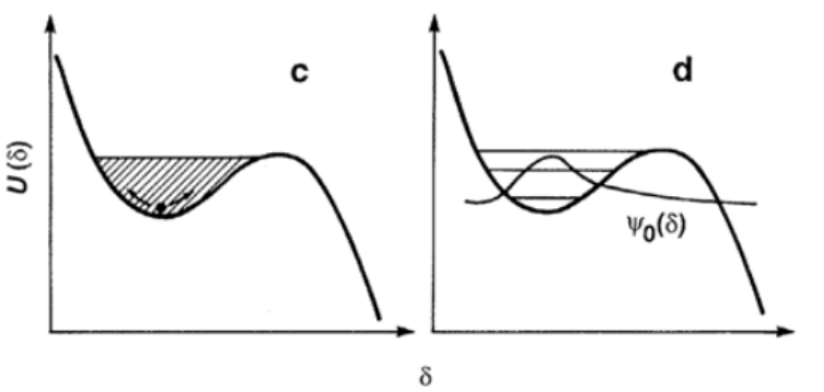 今年诺奖获得者克拉克三人利用超导约瑟夫森结所构成的电路,尺度上是宏观的,其势能曲线如下图,那么一个粒子在U型势里被囚禁,如果不具有足够的能量,就不能逃逸出,但是,如果有量子隧穿效应,则有一定的几率逃逸到外边,实验中粒子的能量可以由温度来控制,即温度高时(超过100毫开),粒子能量大,温度低时(约30毫开),粒子能量小,但是如果有量子隧穿的话,低温时仍然有可能逃逸出。