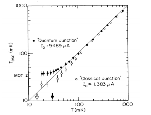 基于这样的框架,我们梳理一下不同的情况:(1) 温度高时(100毫开以上),粒子能量大,会逃逸出束缚,类似于“翻墙”,是一种经典效应。(2) 温度低时(约30毫开),粒子会由于宏观量子隧穿,逃逸出束缚,类似于“穿墙”,是量子效应。所以,如果有宏观量子隧穿,前面这两种情况都会发生逃逸,那如何区分“翻墙”“穿墙”两种情况呢?克拉克等人引入了一个逃逸温度,高温情况下,逃逸温度和实际温度线性相关,低温时逃逸温度是一个确定的数值,和实际温度无关!