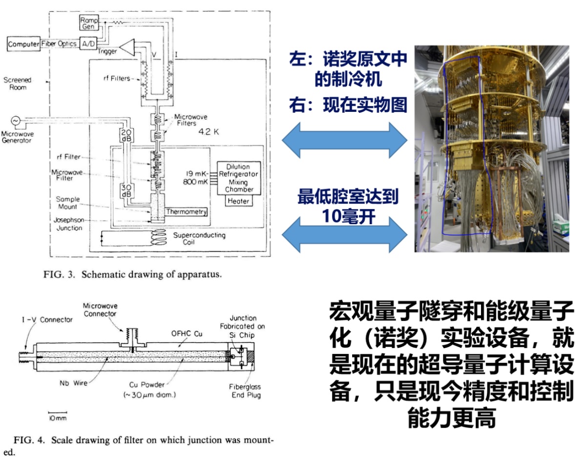 2025年物理诺奖成果,其实验所用到的器件只有10到80微米,大致只有人体头发直径大小,相对仍然较小。 实际上器件需要用光刻机来制备如此精细的器件,但即使这个尺度,通常也很难观测到量子效应,所以诺奖当年的实验是在稀释制冷机所提供的极低温环境做的。可以说,诺奖成果的器件是一种介观器件,实验是在极端条件下,即极低温条件下做的。