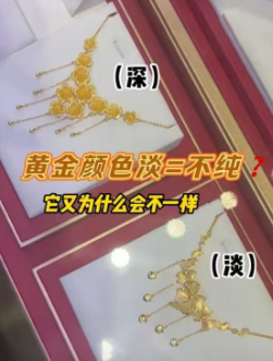 黄金本身的颜色是深赤黄色,纯度越高,颜色确实越接近这种天然深黄色。但颜色并不是判断黄金纯度的标准,长时间佩戴或存放不当、加工工艺、视觉误差等因素都可能影响到黄金的颜色。