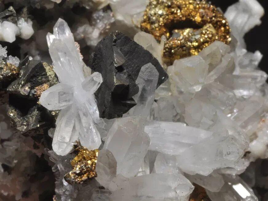 与石英和方铅矿共生的“愚人金”,图片来源:Wikipedia