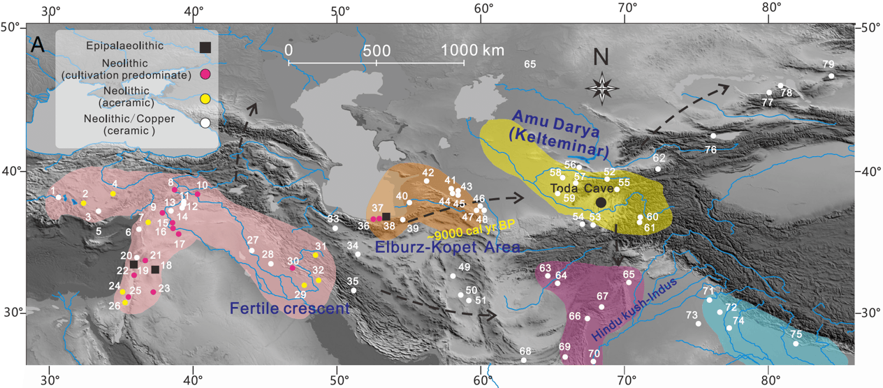 从西亚向东方传播的古代谷物采集者的扩散路线,近东、伊朗、中亚、南亚早期新石器时代遗址及Toda-1洞遗址的分布