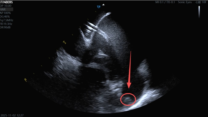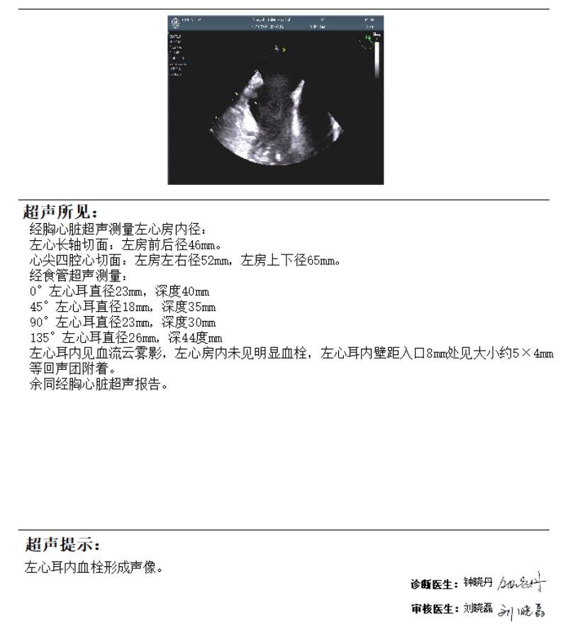 ▲超声提示患者左心耳内血栓形成