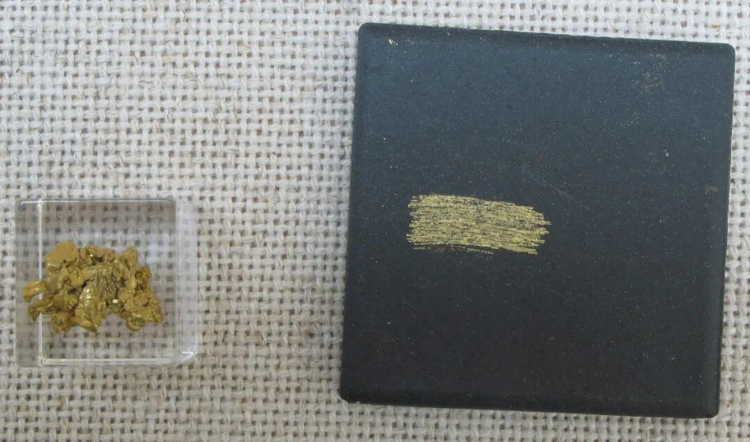 把黄金当作笔,在不带釉的白色瓷板上轻轻划动,很容易留下条痕,黄金的条痕同样是黄色。但黄铁矿的条痕常常是绿黑色,与黄金差别极大。