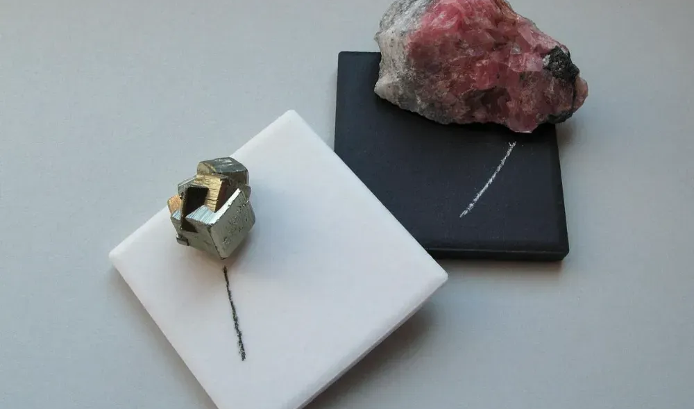 左图为黄金的条痕;右图下方为黄铁矿的条痕。图源:wikimedia