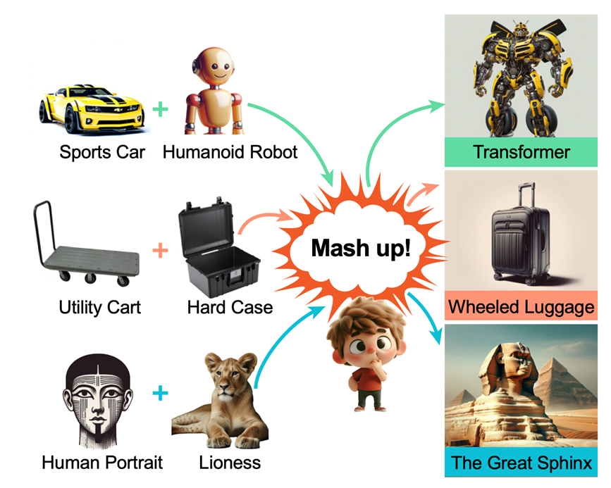在众多创造力形式中,组合创造力(combinational creativity)被心理学家Margaret Boden视为最基础的一种——通过有意义地结合熟悉的概念来产生新想法。从带轮行李箱(手推车+硬壳箱)到狮身人面像(人脸+狮身),这种“连接事物”的能力创造了人类文明中无数的创新作品,如图1所示。