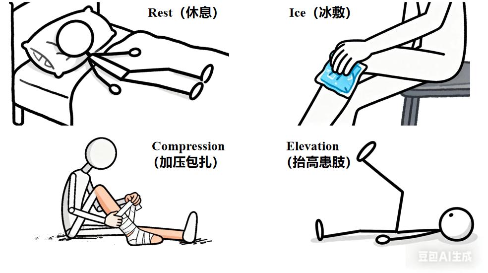 1、若运动时出现关节疼痛,应立即停止活动,并采用“RICE原则”: