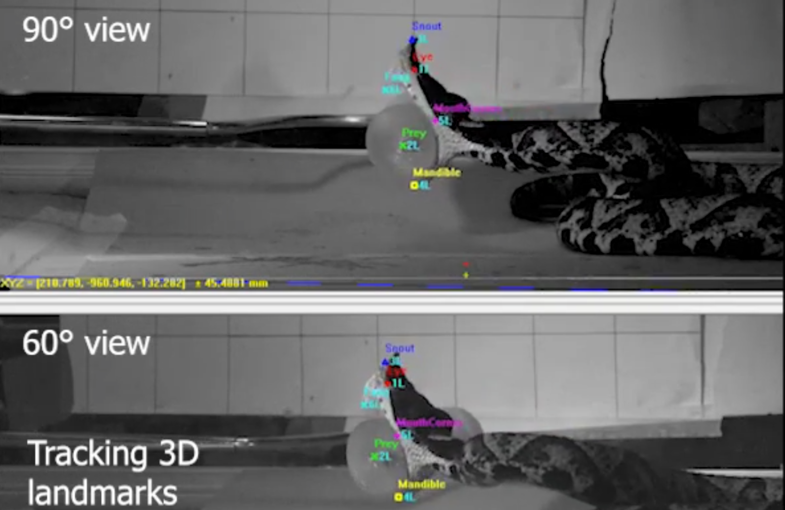 从两个视角重建蝰蛇捕食攻击的三维运动学(图片来源:参考文献[1])