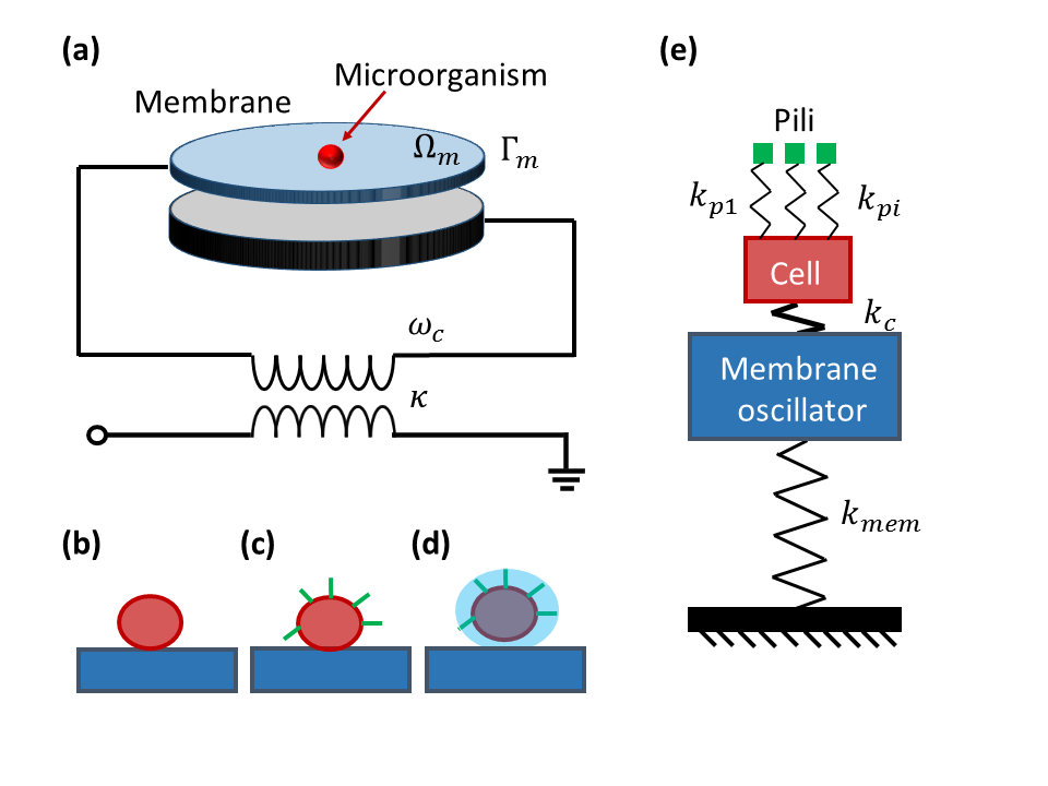 近年来,科学家在低温超导电路系统中把直径15微米,厚100纳米的铝薄膜机械振子冷却到量子基态,并制备其量子叠加。2016年,与李统藏合作,我们提出把细菌冷冻后粘到这个薄膜表面(如图2所示)。如果制备薄膜的量子叠加态,也就实现了细菌的量子叠加。