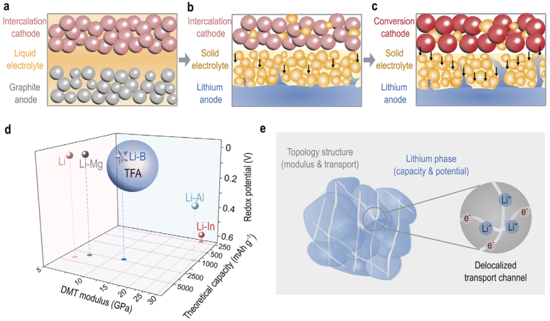 (e), 所提出的典型 TFA 材料示意图,展示其骨架拓扑结构可在保持优异机械性能的同时,提供离子与电子的非局域化传输通道。