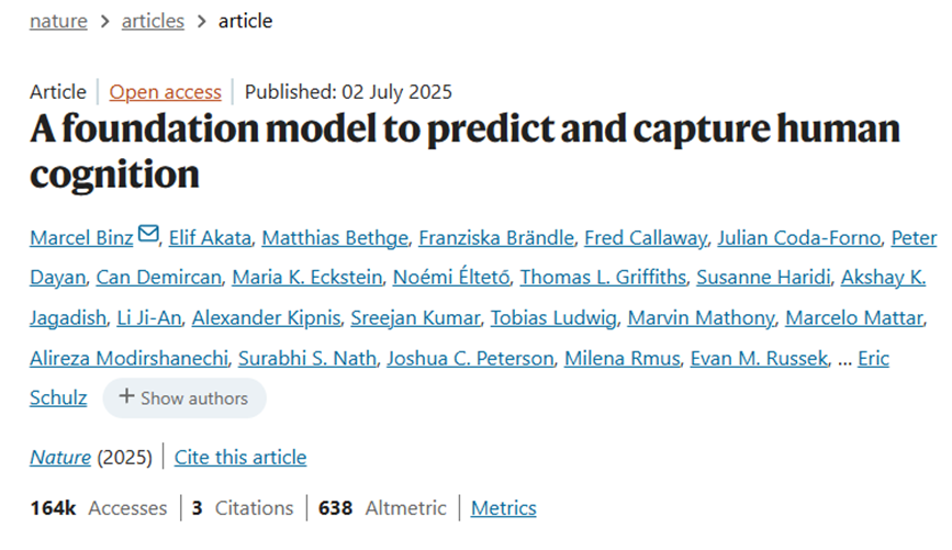 [1] Binz, M., Akata, E., Bethge, M., Brändle, F., Callaway, F., Coda-Forno, J., Dayan, P., Demircan, C., Eckstein, M. K., Éltető, N., Griffiths, T. L., Haridi, S., Jagadish, A. K., Ji-An, L., Kipnis, A., Kumar, S., Ludwig, T., Mathony, M., Mattar, M., & Modirshanechi, A. (2025). A foundation model to predict and capture human cognition. Nature. https://doi.org/10.1038/s41586-025-09215-4