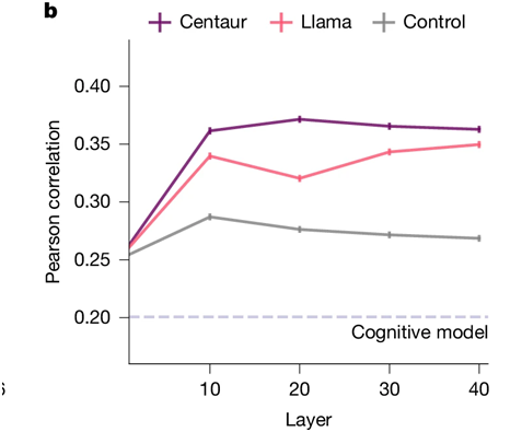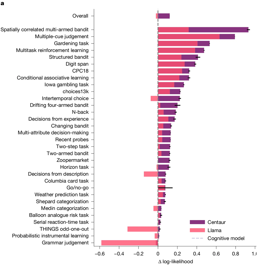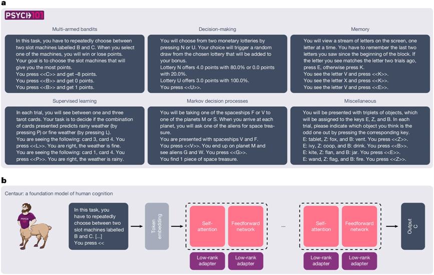有了数据集,便可以对开源大模型 Llama3-70B 进行微调,所谓微调,相当于让大模型进行专科教育,使得模型能够更熟悉 Psych-101 中这些数据,成为预测人类如何做选择的专家,而这个微调后的开源模型,被称为“半人马”(图1b)。