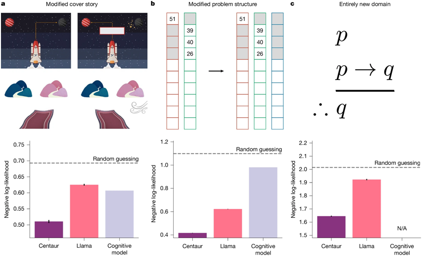 为了说明“半人马”并没有过拟合,研究者接下来对心理学实验生成了诸多变种。例如将背景故事中的驾驶宇宙飞船前往外星寻找资源( Psych-101 中的数据)变为在一个魔法世界里乘坐魔毯去寻宝,结果显示,在变种的故事中,“半人马”的表现依旧不差(图4a)。