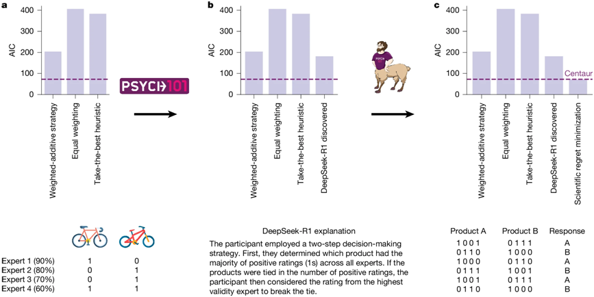 研究人员首先使用“半人马”模拟人类在多属性决策(multi-attribute decision-making)任务做出的选择,该任务中,被试者根据几个专家的估计进行决策,不同的专家有不同的置信度。“半人马“模型模拟人类,在各种场景下做出决策,之后将这些选择的案例集交给 Deepseek-R1,由Deepseek去总结人类决策依据的规则。