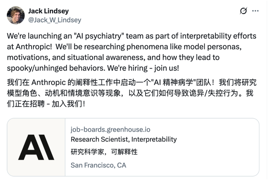 图7:X截图,对应Anthropic 准备招募大模型精神病学研究,以促进模型可解释性