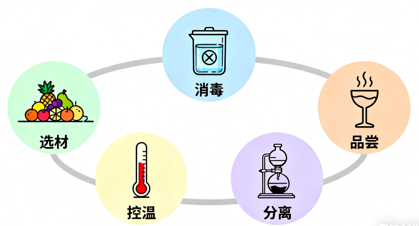 消毒:最关键的一步!容器及所有接触工具必须用沸水或专业消毒剂(如酿酒用亚硫酸盐)严格消毒。
