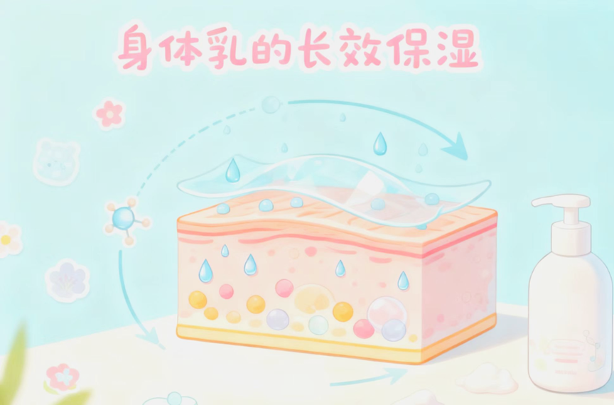 如果只有补水成分,皮肤吸收的水分很快会随 TEWL 流失。因此,身体乳中必须添加 “锁水成分”,在皮肤表面形成一层保护膜,减缓水分蒸发速度。