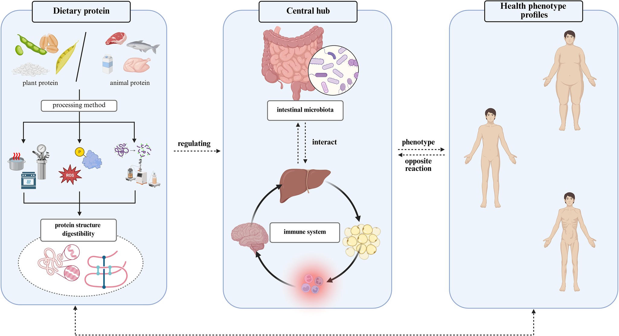 (图 1|蛋白质–肠道微生物–机体健康框架图。研究聚焦不同蛋白质来源的营养健康效应。图中左侧为输入变量:蛋白来源作为核心变量,加工方式作为外部变量;中间展示肠道菌群为枢纽的多器官调节机制;右侧为输出变量:不同蛋白来源诱导的个体健康差异性表型。)