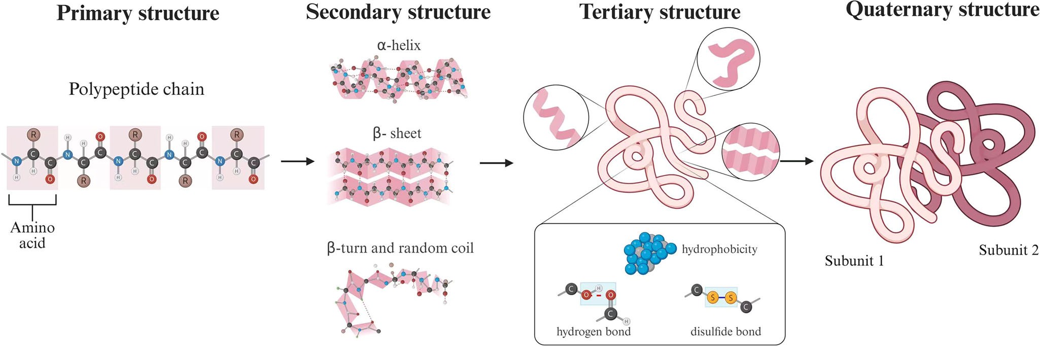 (图 2|蛋白质的三维空间结构层次。蛋白的空间结构通常分为四个层级:一级、二级、三级与四级结构,由线性序列逐步构建为复杂空间组装,决定其功能与消化特性。)