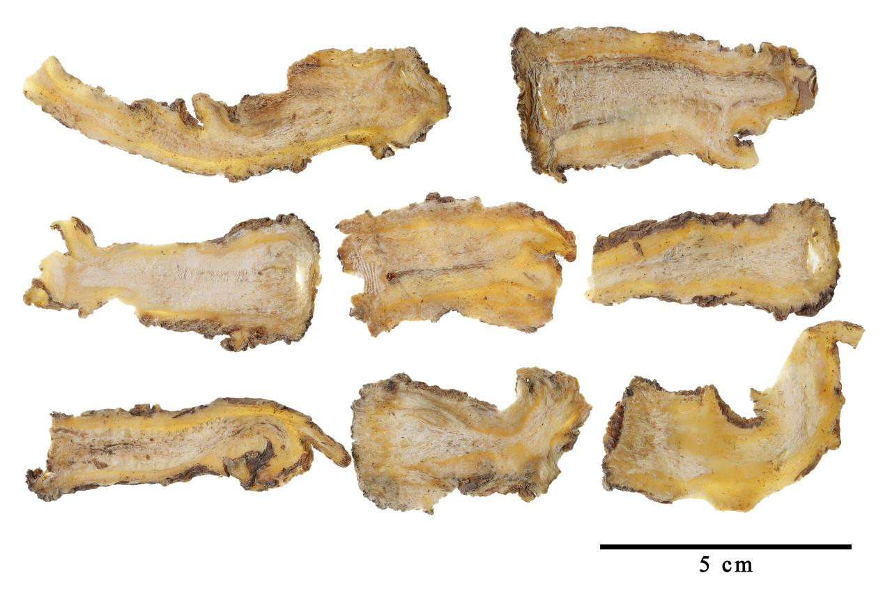 根据当归药材加工情况,将当归药材分为“全归”“归头”“归尾”三个规格。