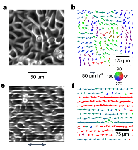 图2:细胞在不同表面的行为对比。上图(平坦表面): 细胞形态杂乱(左),速度矢量图显示其运动方向混乱,形成漩涡(右)。下图(沟槽表面): 细胞沿着沟槽方向伸展、排列整齐(左),速度矢量图清晰地显示出方向相反、高度有序的“车道”(右)。