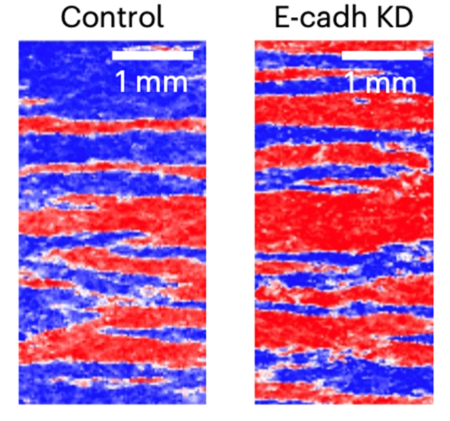 随后,他们使用了一种特殊的可视化技术来观察细胞的运动模式:用红色表示向一个方向(比如向右)运动的区域,用蓝色表示向相反方向(比如向左)运动的区域。如果队列依然整齐,我们就会看到清晰的红蓝相间的条纹。结果如下: