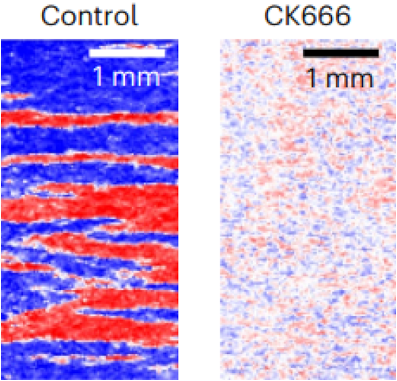图4:细胞自身的“运动引擎”是形成有序队列的必要条件。左图:正常细胞(对照组)形成了清晰的红蓝相间“车道”。右图:当细胞的“运动引擎”被药物CK666抑制后,“车道”完全消失,细胞运动恢复到一片混乱、凝滞的状态。
