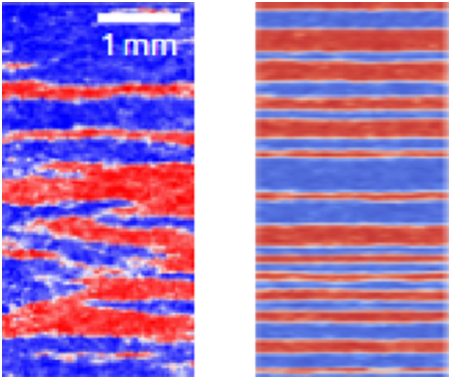 图5:计算机模拟结果。基于设定的物理规则,模型成功再现了双向有序通道的形成。左图:真实实验中的细胞“车道”。 这是在显微镜下观察到的真实细胞群体的运动模式图。右图:计算机模拟出的“车道”。 这是基于简单物理规则,在计算机中模拟出的虚拟细胞运动模式。
