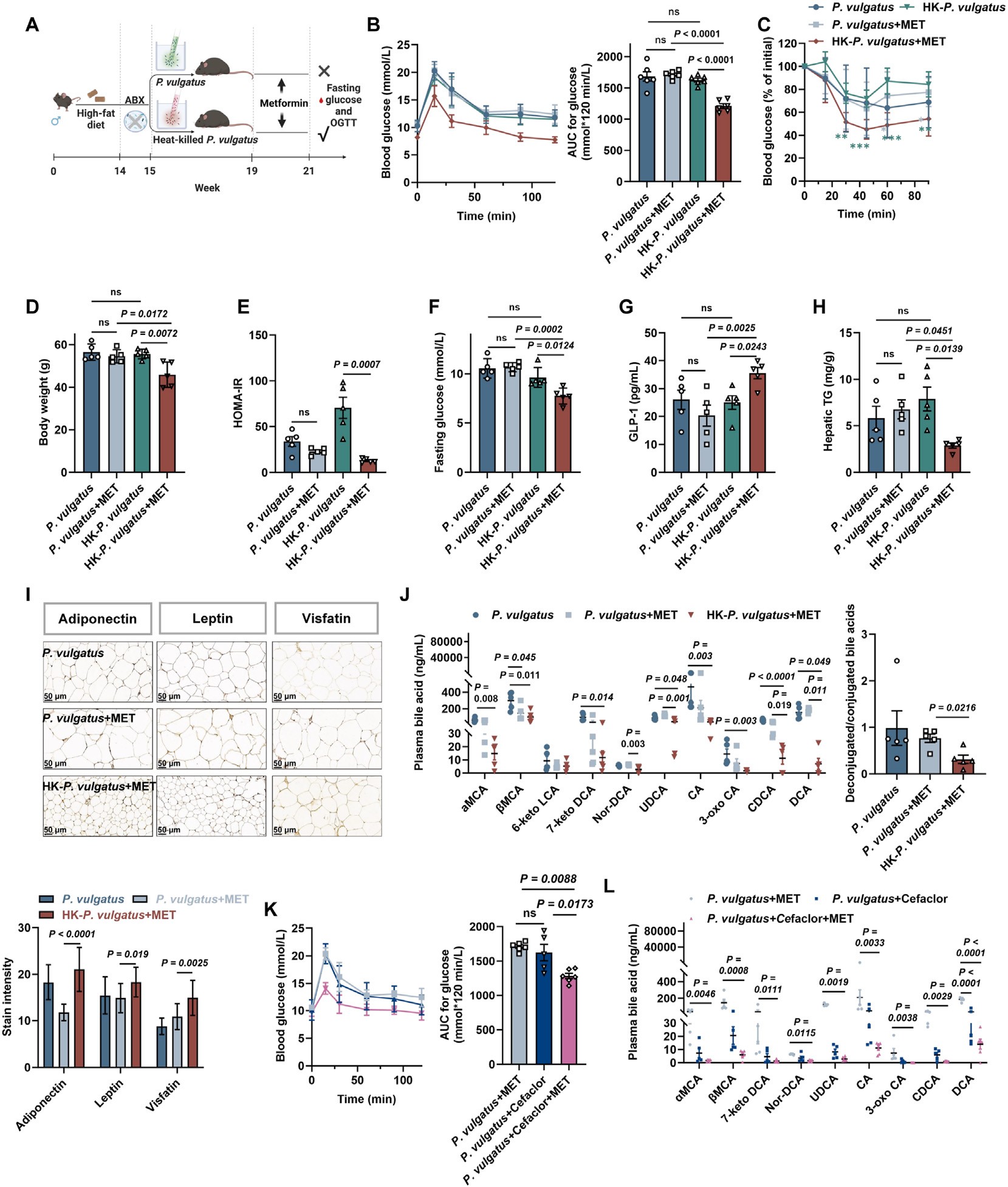 (P. vulgatus 定植可逆转高脂饮食小鼠中二甲双胍的降糖效果。实验小鼠在高脂饮食下饲养 14 周以评估逆转效应;A:定植 P. vulgatus 或热灭活菌株于抗生素诱导的无菌小鼠;B:葡萄糖耐量及曲线下面积;C:胰岛素耐受测试等。)