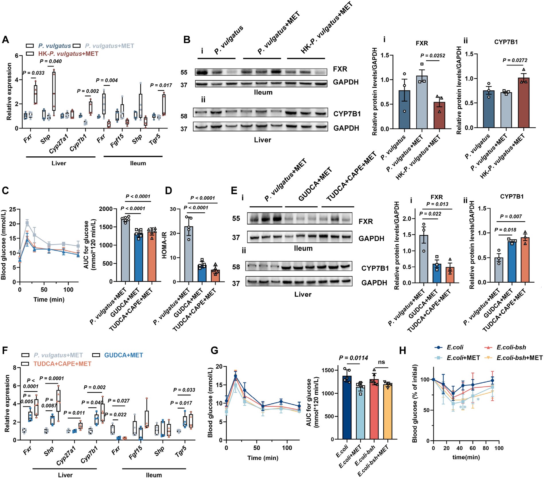 ( P. vulgatus 诱导的二甲双胍无反应涉及肠道 FXR 信号通路。A:肝脏与回肠中 Fxr 及其靶基因的相对表达;B:FXR 与 CYP7B1 蛋白水平的免疫印迹;C–D:给予 GUDCA 或 TUDCA +CAPE 干预后 OGTT 与 HOMA-IR 的变化。)