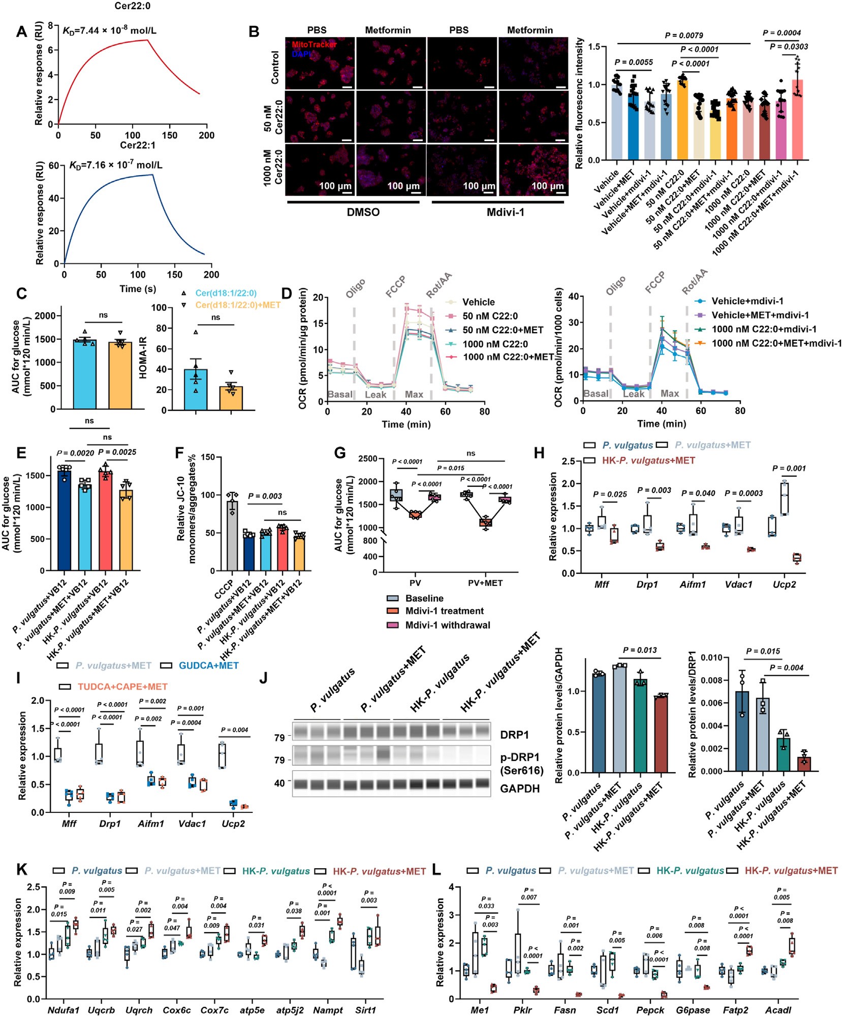 ( P. vulgatus 与二甲双胍共存诱导线粒体碎裂、氧化磷酸化损伤及脂肪酸 β 氧化下降。A:神经酰胺 C22:0/C22:1 与 MFF 蛋白的亲和力;B:MitoTracker 染色下的线粒体膜电位;C:口服耐糖曲线及 HOMA-IR 比较;D:HepG2 细胞氧耗率;E:腺苷钴胺处理小鼠的 OGTT 结果等。)