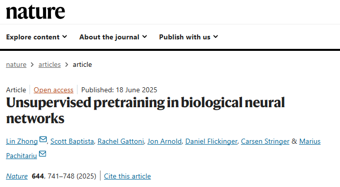 [1] Zhong, Lin, et al. "Unsupervised pretraining in biological neural networks." Nature 644.8087 (2025): 741-748.