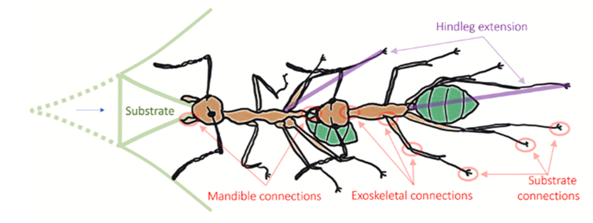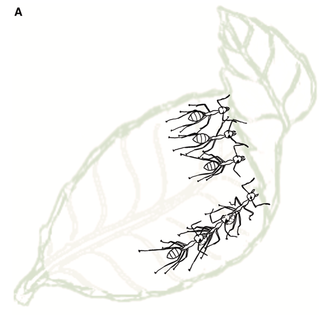 图1:自然界的“活锁链”。 在野外,织叶蚁通过首尾相连的方式组成链条,协同拉动叶片,为建造巢穴做准备。这种看似简单的行为,背后隐藏着高效的协作智慧。