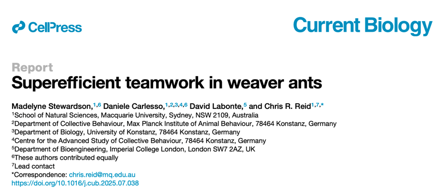 论文信息:Stewardson, Madelyne, et al. "Superefficient teamwork in weaver ants." Current Biology 35.17 (2025): 4270-4275.
