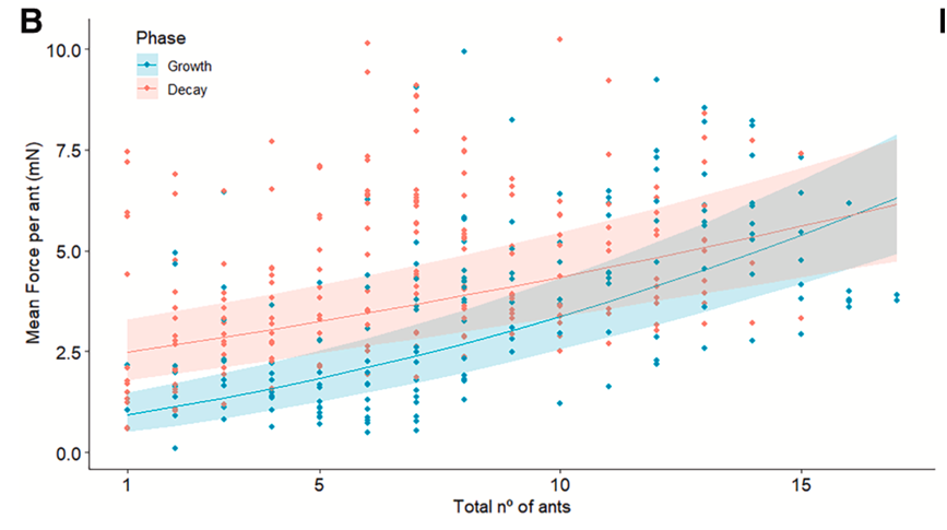 图2:团队越大,个体越强。 实验数据显示,随着织叶蚁团队规模的增加,平均每只蚂蚁贡献的力量(以自重倍数计)不降反升,呈现出与人类“林格尔曼效应”完全相反的“超高效”现象。