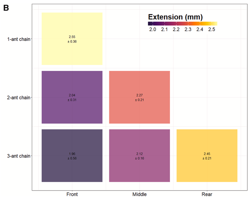 图4:分工的姿态证据。 研究发现,链条后段作为“被动抵抗者”的蚂蚁,其后腿伸展程度显著高于前段的“主动拉拽者”。这种伸展姿态是一种高效的抵抗姿态,为“力棘轮”模型提供了有力支持。