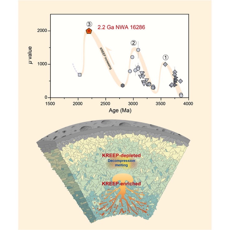 更令人惊讶的是,该陨石的月幔源区表现出异常的地球化学特征:其238U/204Pb高达 2000,远超大多数月海玄武岩(通常为60~1000);同时其εNd(t) 值低至 –4.3,与典型KREEP玄武岩源区非常接近。这些特征明确表明,该玄武岩源自一个富集KREEP组分的月幔源区。这一发现将月球KREEP相关的火山活动的存续期延长了约 8亿年,续写了月球“热引擎”的功能。