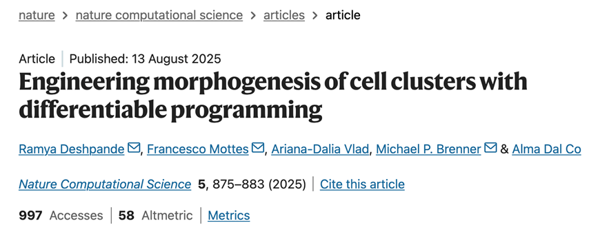 论文信息:Deshpande, R., Mottes, F., Vlad, AD. et al. Engineering morphogenesis of cell clusters with differentiable programming. Nat Comput Sci (2025).
