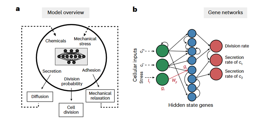 有了“感知”(化学与机械)和“行动”(分裂与分泌),问题的关键就变成:细胞内部的“决策手册”——也就是基因调控网络——该如何编写?图3展示的,正是这一步的核心:用可微分编程来优化细胞的行为规则。