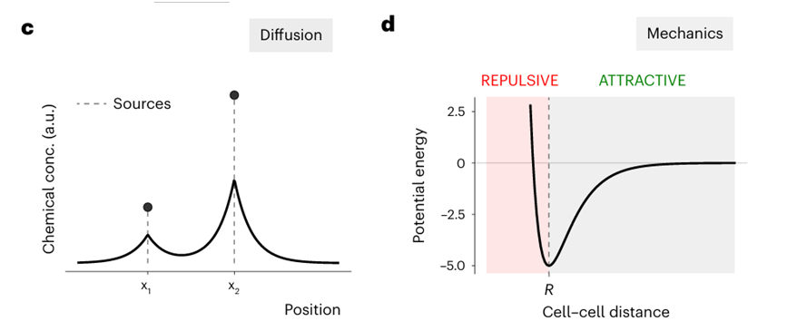 细胞不仅会“闻”,还会“摸”。把细胞想象成一个个柔软但有弹性的球。当两个细胞靠得太近时,它们会产生排斥力(图2右图中细胞距离曲线的左侧“REPULSIVE”区域),防止彼此重叠,这模拟了细胞膜的“排他性”。而当它们保持一个恰到好处的距离时,又会产生吸引力(图2右图中细胞距离曲线的右侧“ATTRACTIVE”区域),这模拟了细胞间的“粘附”性,让组织能保持完整而不散架。